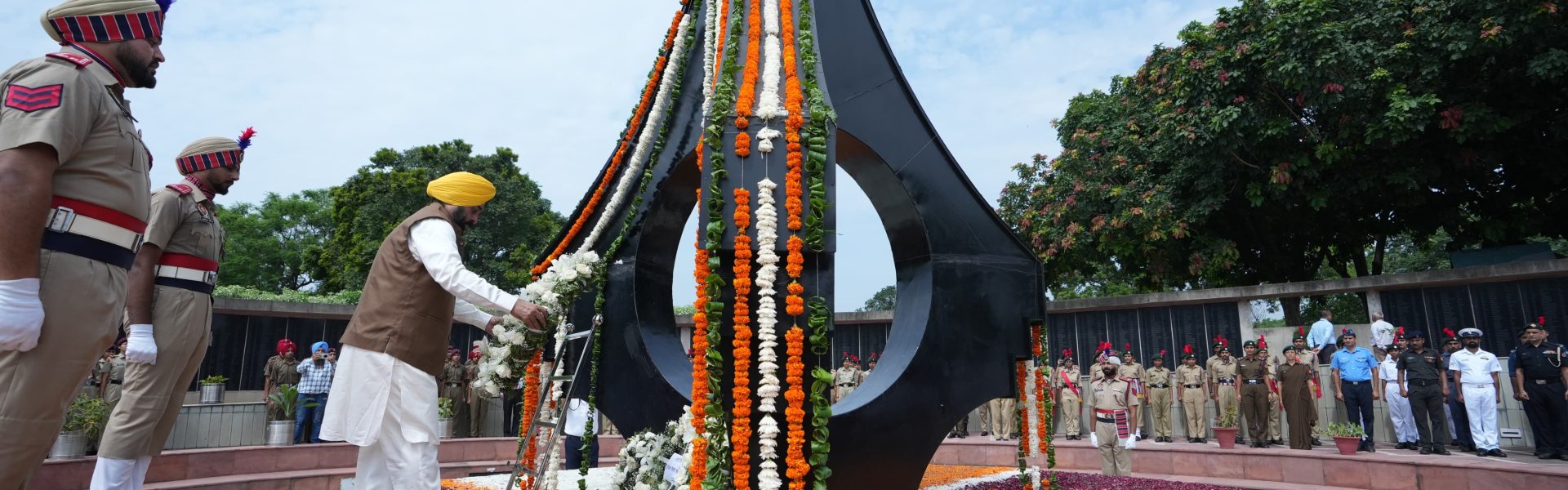 ਸ਼ਹੀਦਾਂ ਵਿਰੁੱਚ ਸ਼ਰਧਾ ਅਤੇ ਸਤਿਕਾਰ ਦਾ ਇਜ਼ਹਾਰ ਕਰਦਿਆਂ ਮੁੱਖ ਮੰਤਰੀ ਨੇ ਬੋਗਨਵਿਲੀਆ ਗਾਰਡਨ ਵਿੱਚ ਸਥਿਤ ਜੰਗੀ ਸਮਾਰਕ ’ਤੇ ਫੁੱਲਾਂ ਦੀ ਮਾਲਾ ਚੜ੍ਹਾਈ ਅਤੇ ਕਾਰਗਿਲ ਜੰਗ ਦੌਰਾਨ ਜਾਨਾਂ ਨਿਭਾਉਣ ਵਾਲੇ ਪੰਜਾਬ ਦੇ ਸੂਰਮਿਆਂ ਨੂੰ ਨਮਨ ਕਰਦਿਆਂ ਸ਼ਰਧਾਂਜਲੀ ਅਰਪਿਤ ਕੀਤੀ।