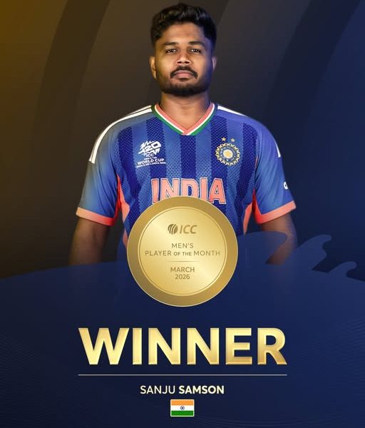 India’s dynamic wicketkeeper-batter Sanju Samson has been named the ICC Men’s Player of the Month for March 2026, capping off a sensational performance at the ICC Men’s T20 World Cup 2026 where his explosive batting played a pivotal role in India’s record third title triumph.