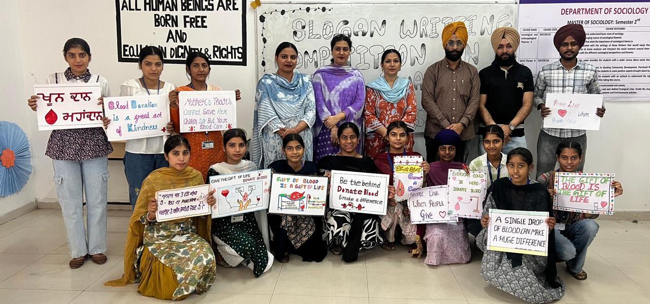 The Department of Sociology at Sri Guru Granth Sahib World University, Fatehgarh Sahib, organized a Slogan Writing Competition to celebrate National Voluntary Blood Donation Day. The event, centered on the theme of blood donation, aimed to raise awareness about its societal importance and inspire students to creatively promote this noble cause.