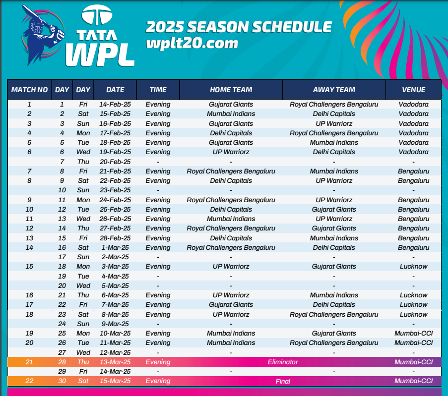 The Board of Control for Cricket in India (BCCI) today announced the highly anticipated schedule for the TATA Women’s Premier League (WPL) 2025. The third edition of this thrilling tournament will feature four vibrant cities – Baroda, Bengaluru, Lucknow, and Mumbai – as hosts.